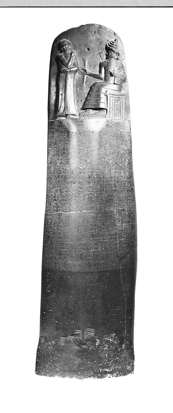 Above the densely textured law code, King Hammurabi is shown on a mountaintop with the seated sun god Shamash, who orders the king to write down the laws for the people of Babylon. A graphic image of divine authority as the source for the code becomes powerful visual persuasion.