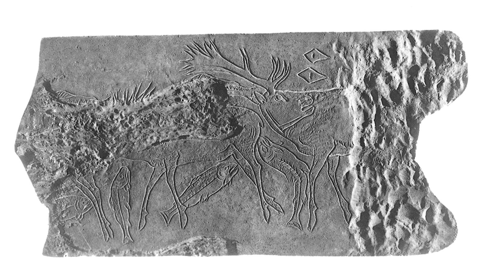1–4. Engraved drawing on a deer antler This prehistoric image is shown in a cast made by rolling the antler onto clay. Date 15000BCE Add Tags Tags: Filter by Motivation Audience General Combined Mark Sanders identifyingdocumenting documentingidentifying Add Note notes