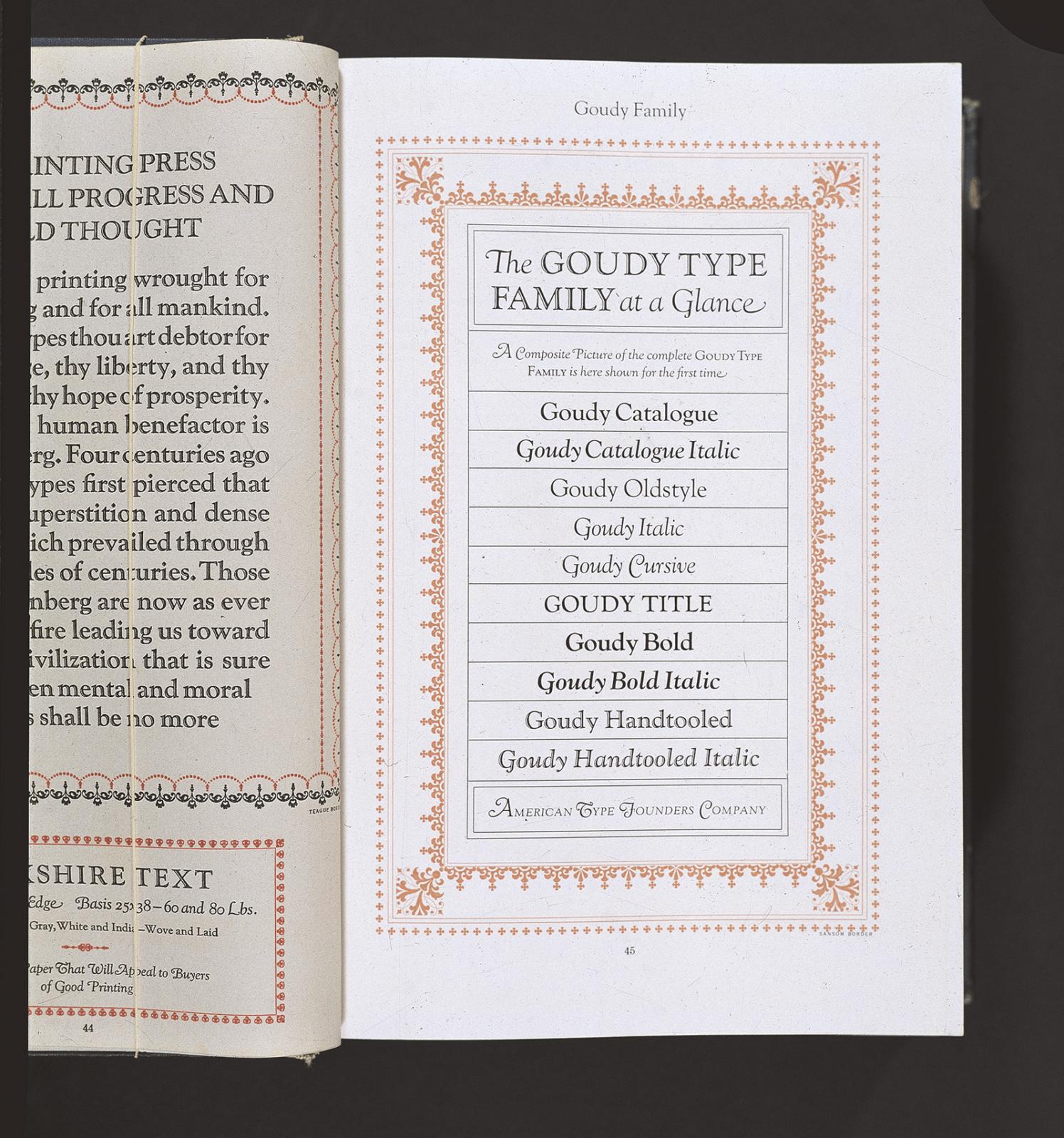 10–38. Page 45 from American Type Founders’ Specimen Book and Catalogue presented the Goudy series of Old Style fonts, including fonts designed by others. Date 1923CE Place Add Tags Tags: Filter by Motivation Audience General Combined Add Note notes