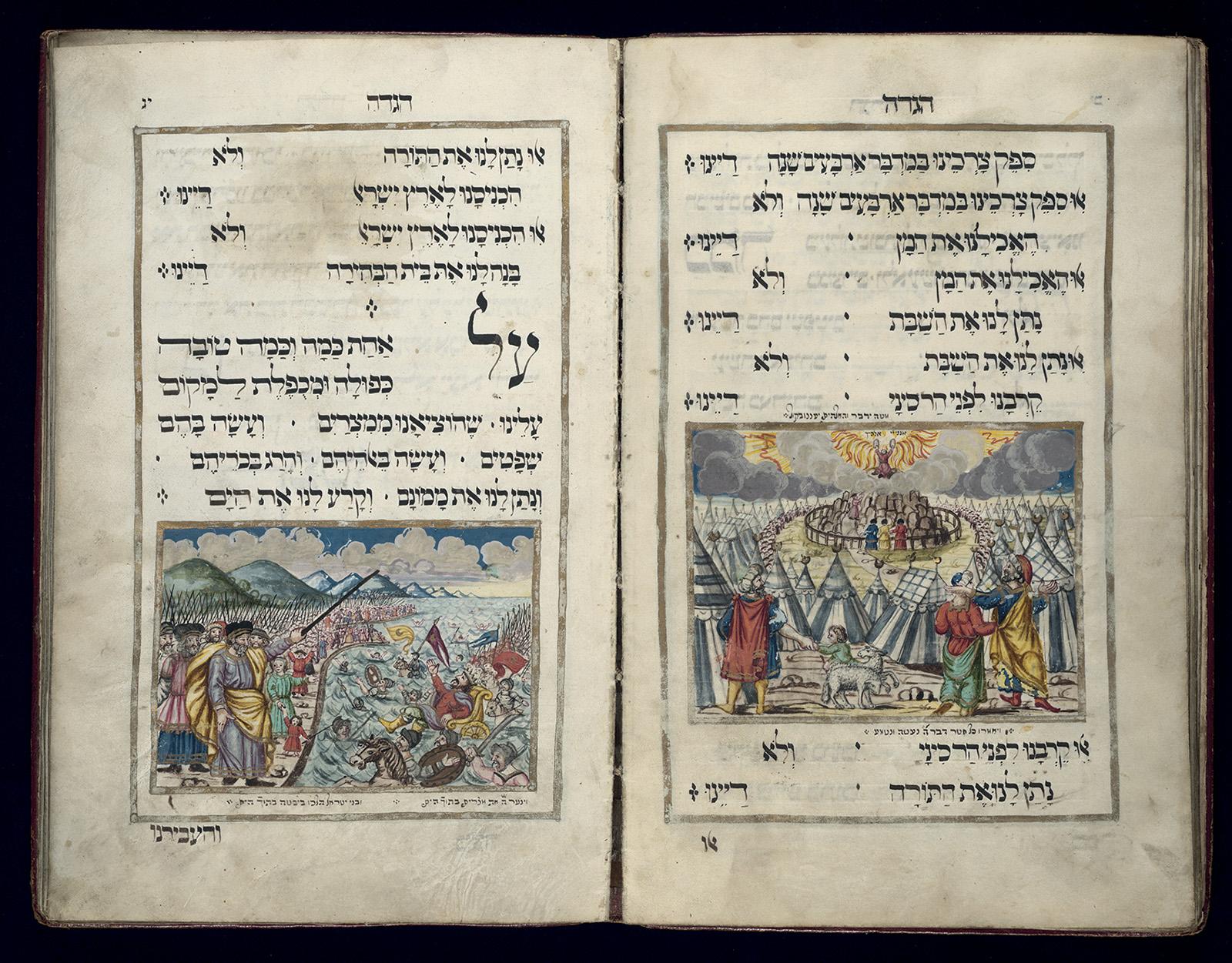 Copied by Moses ben Nathan Oppenheim.The images depict Mount Sinai, and the pharaoh and his army drowning in the Red Sea. The layout implies the melodic rhythm of a buoyant Passover song through spacing and symbols.