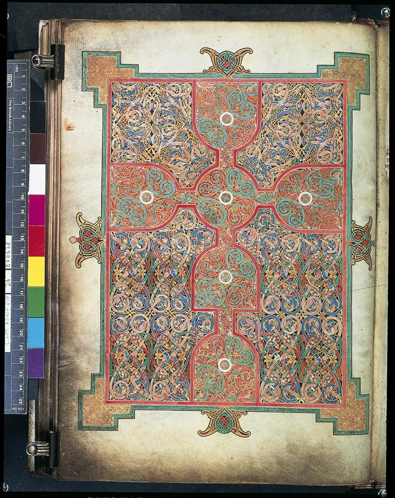 Carpet page facing the opening of Saint Matthew. A mathematical grid buried under swirling lacertine birds and quadrupeds brings structure to the textured areas. A red, contoured cross with white circular forms contrasts against a background of complex decoration.