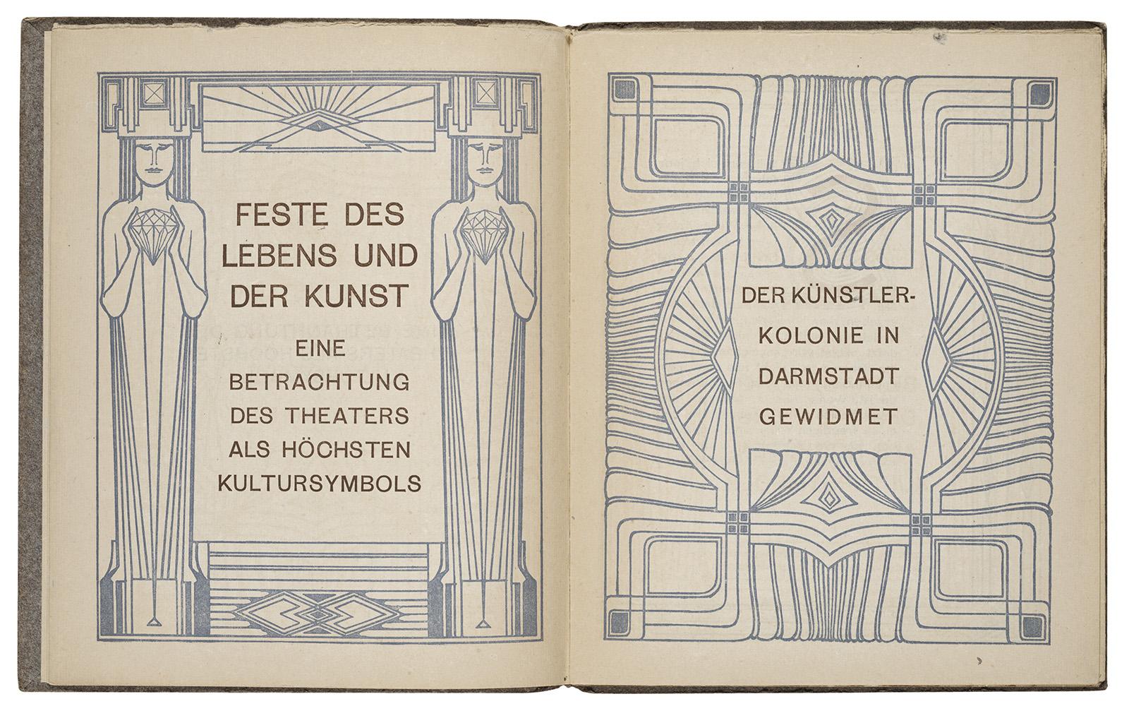 12–26. Peter Behrens, title and dedication pages for Feste des Lebens und der Kunst: eine Betrachtung des Theaters als höchsten Kultursymbols