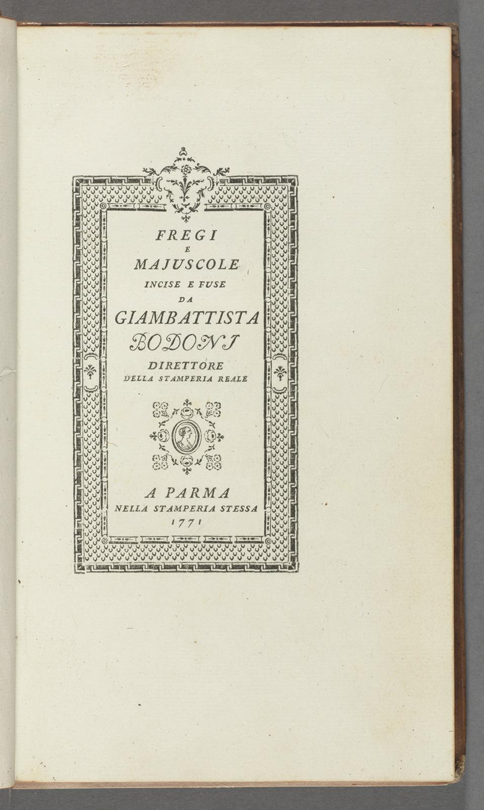 8–22. Giambattista Bodoni, type specimen title page from Fregi e Majuscole