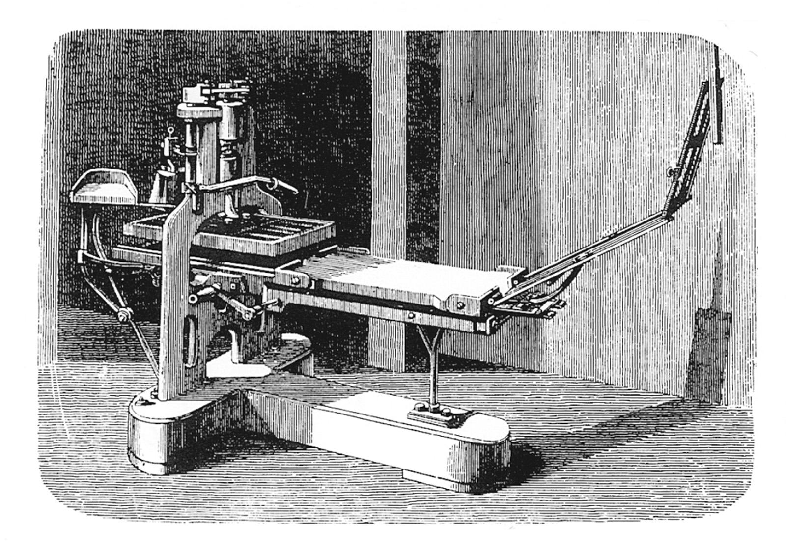 9–21. This engraved illustration depicts the printing press of all-iron parts invented in England by Charles Stanhope