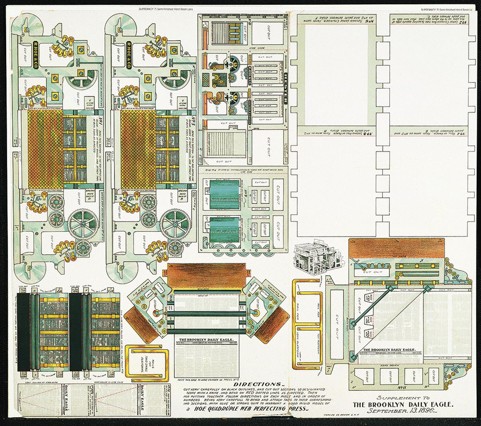 9–50. This paper model of the Hoe “quadruple web-perfecting press,” printed using chromolithography, was published on 13 September 1896 in a supplement to the Brooklyn Daily Eagle.